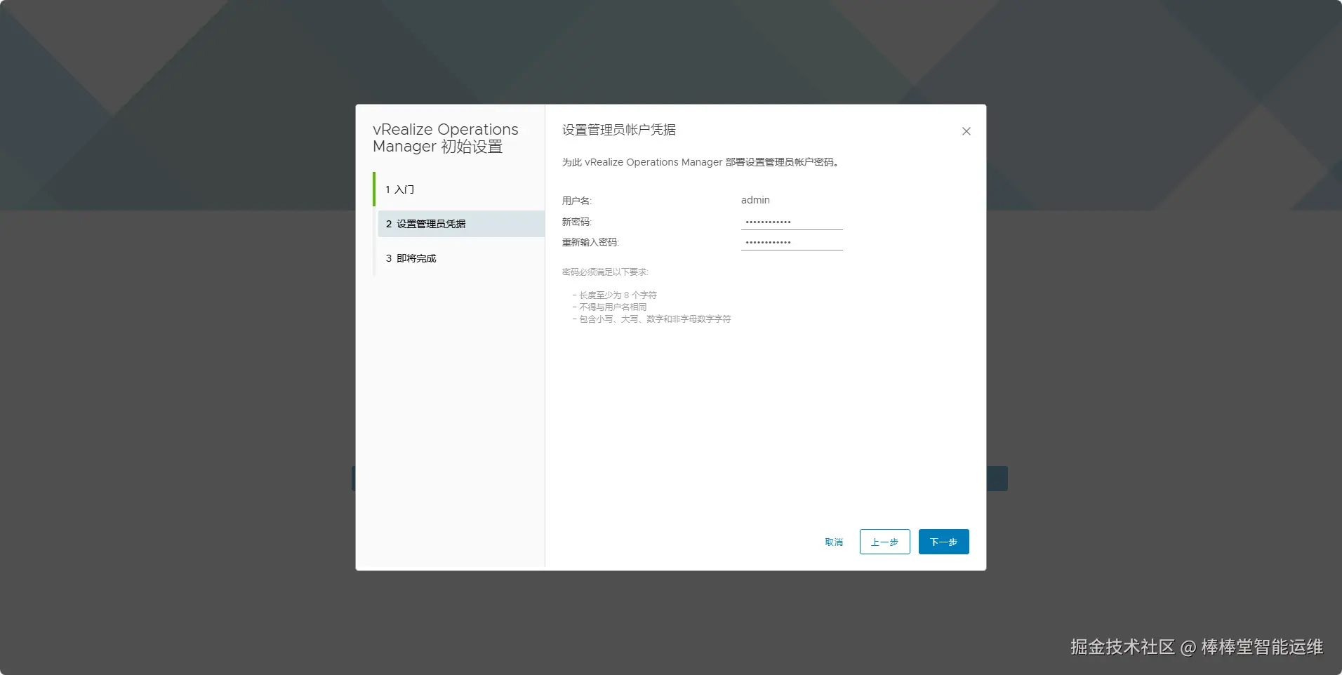 (3)在向导“2 设置管理员凭据”中为此vRealize Operations Manager部署设置管理员账户密码。如图5-13所示。