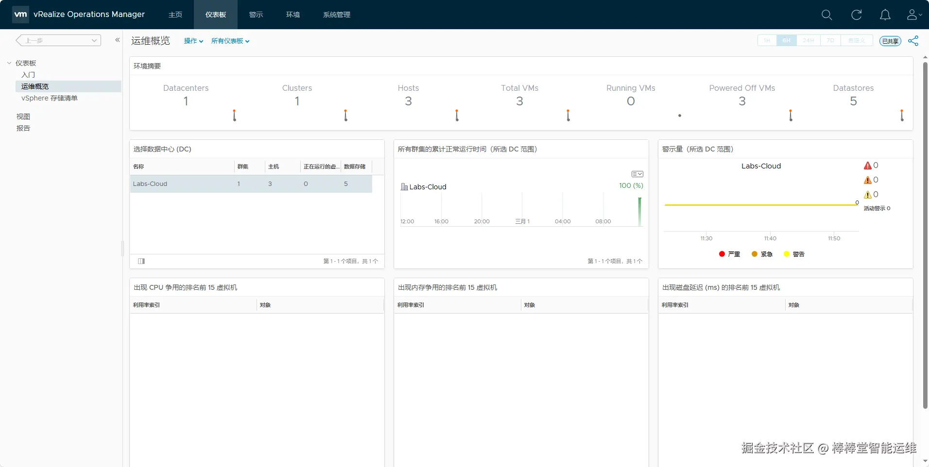 - 选择“入门”界面“操作”单击【运维概览】,选中数据中心“Labs-Cloud”,查看环境摘要、其所有群集的累计正常运行时间、警示量,如图5-28所示。