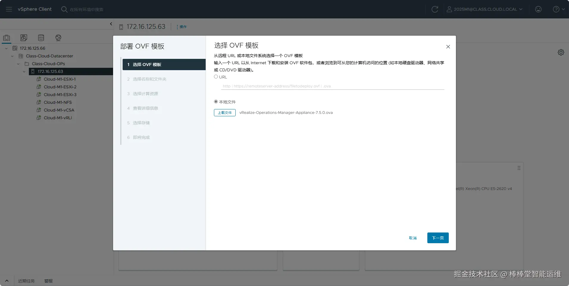 (3)在vSphere Web Client控制台中,选中ESXi主机,右击,选择【部署 OVF 模板】弹出向导框,在向导的“1 选择OVF模板”中选择“本地文件”,单击【选择文件】,选择“vRealize-Operations-Manager-Appliance-7.5.0.ova”文件,单击【NEXT】,如图5-1所示。