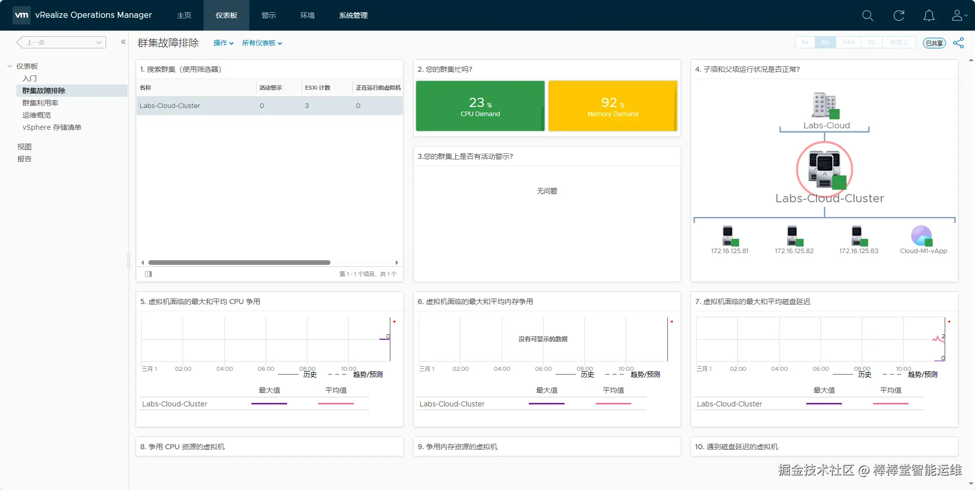 - 选择“入门”界面“性能故障排除”,单击【群集故障排除】,选择“Labs-Cloud-Cluster”集群,查看集群的状态、子项父项运行状况、虚拟机面临的最大和平均CPU争用等指标,如图5-30所示。