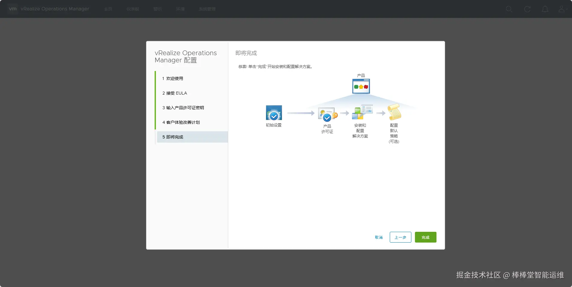 (8)在向导“5 即将完成”中,单击【完成】,开始安装和配置解决方案。至此,vRealize Operations初始化完成,如图5-18所示。