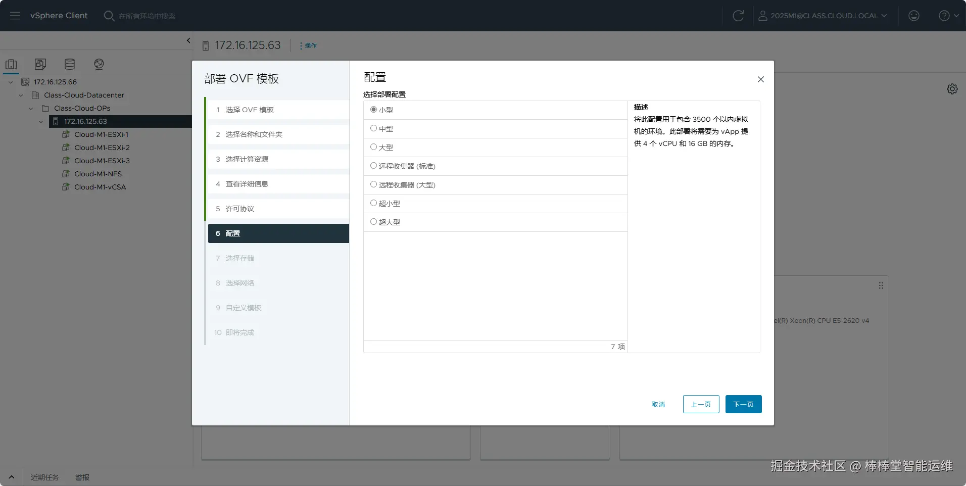 (8)在向导“6 配置”中根据实际需要选择部署配置,本次实验勾选“小型”部署配置,单击【NEXT】,如图5-6所示。