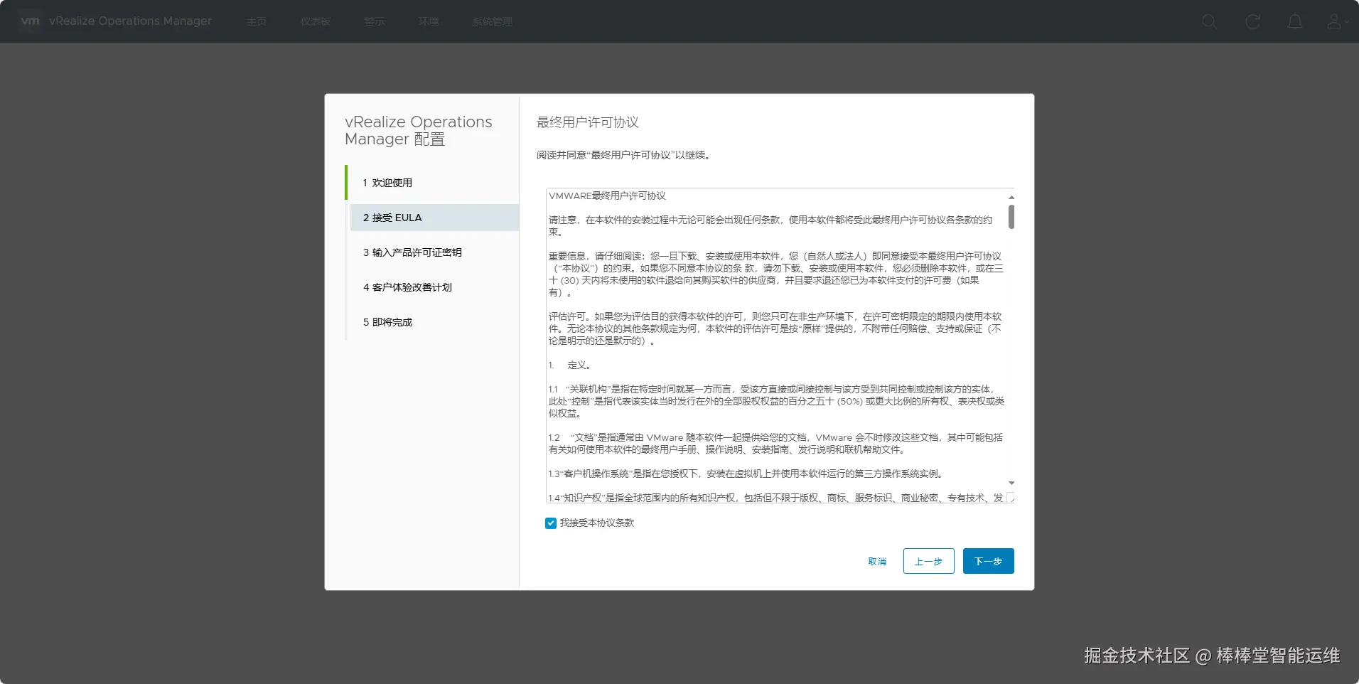 (6)初始配置完成后,登录vRealize Operations ,根据提示进行vRealize Operations Manager 配置,在向导“1 欢迎使用”中点击【下一步】,在向导“2 接受 EULA”中点击【下一步】,如图5-16所示。