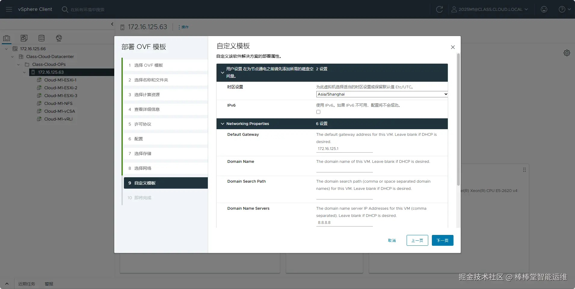 (11)在向导“9 自定义模板”中自定义该软件解决方案的部署属性,时区设置选择“Asia/Shanghai”,并设置IP地址、子网掩码、DNS和默认网关,Default Gateway设置为“172.16.125.1”,Domain Name Servers设置为“8.8.8.8”,Network 1 IP Address设置为“172.16.125.86”,Network 1 Netmask设置为“255.255.255.0”,单击【NEXT】,如图5-9所示。