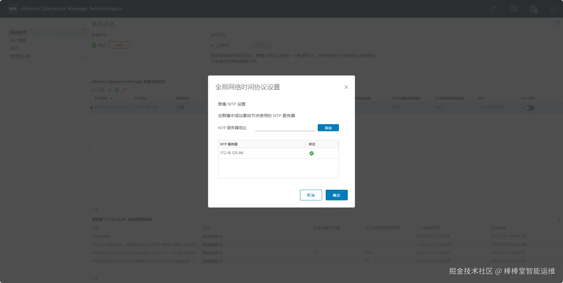 (9)初始化完成后,登录到 vRealize Operations管理界面 (https://172.16.125.86/admin),进行管理系统设置。在vRealize Operations管理界面,单击最右侧“NTP设置”图标,在“全局网络时间协议设置”向导中,主节点将作为现有 NTP 服务器列出,单击【添加】,可添加辅助NTP服务器,如图5-19所示。