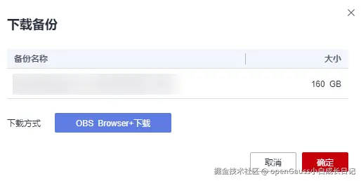 在弹出框中,下载方式仅支持“OBS Browser+下载”,单击“确定”,通过OBS Browser+客户端下载备份文件。