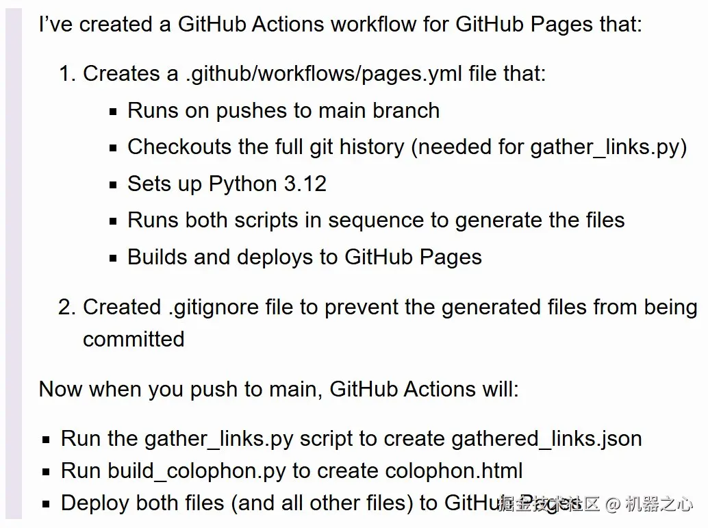 与第一次不同,这次我非常仔细地观察了它在做什么 —— 我不知道如何以这种方式自定义 GitHub Pages 构建,我想学习如何做到这一点,并保持谨慎,因为它可能会产生幻觉并导致任务失败。