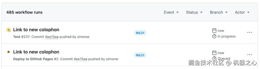 我手动更新了我的 README.md,以在此提交中添加指向新 Colophon 页面的链接,而这又触发了另一次 build。