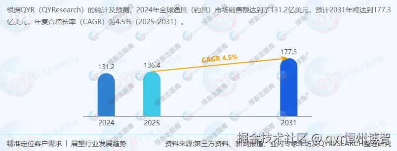 根据QYResearch最新调研报告显示,2024年全球渔具(钓具)市场销售额达到了131.2亿美元,预计2031年将达到177.3亿美元,年复合增长率(CAGR)为4.5%(2025-2031)。这一数据表明全球渔具市场正保持稳定增长态势。