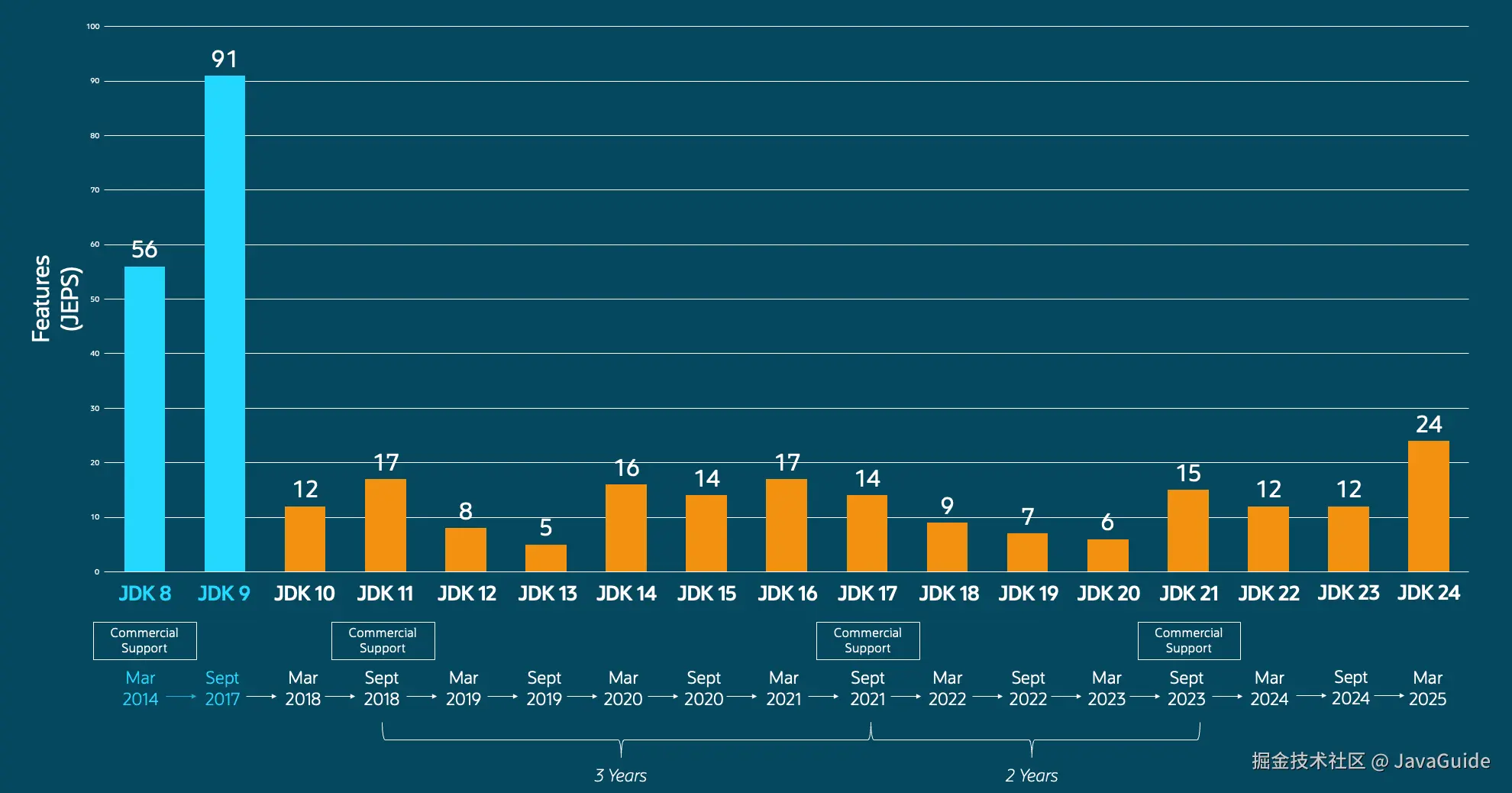 下图是从 JDK8 到 JDK 24 每个版本的更新带来的新特性数量和更新时间: