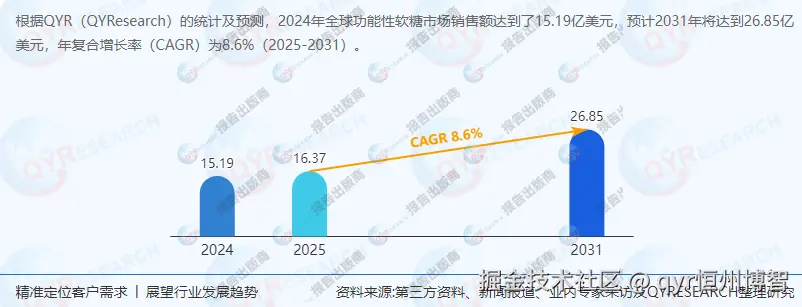 全球市场规模:根据QYResearch最新调研报告显示,2024年全球功能性软糖市场销售额达到了15.19亿美元,预计2031年将达到26.85亿美元,年复合增长率(CAGR)为8.6%(2025-2031)。这一数据彰显了全球功能性软糖市场的强劲增长潜力。