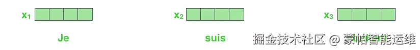 如图2所示,首先通过Word2Vec等词嵌入方法将输入语料转化成特征向量,论文中使用的词嵌入的维度为d_{\text{model}} = 512。在最底层的块(block)中,这些特征向量将直接作为Transformer的输入,而在其他层中,输入则是上一个块的输出。为了便于图示,我们将使用更简单的例子来表示接下来的过程,如图3所示: