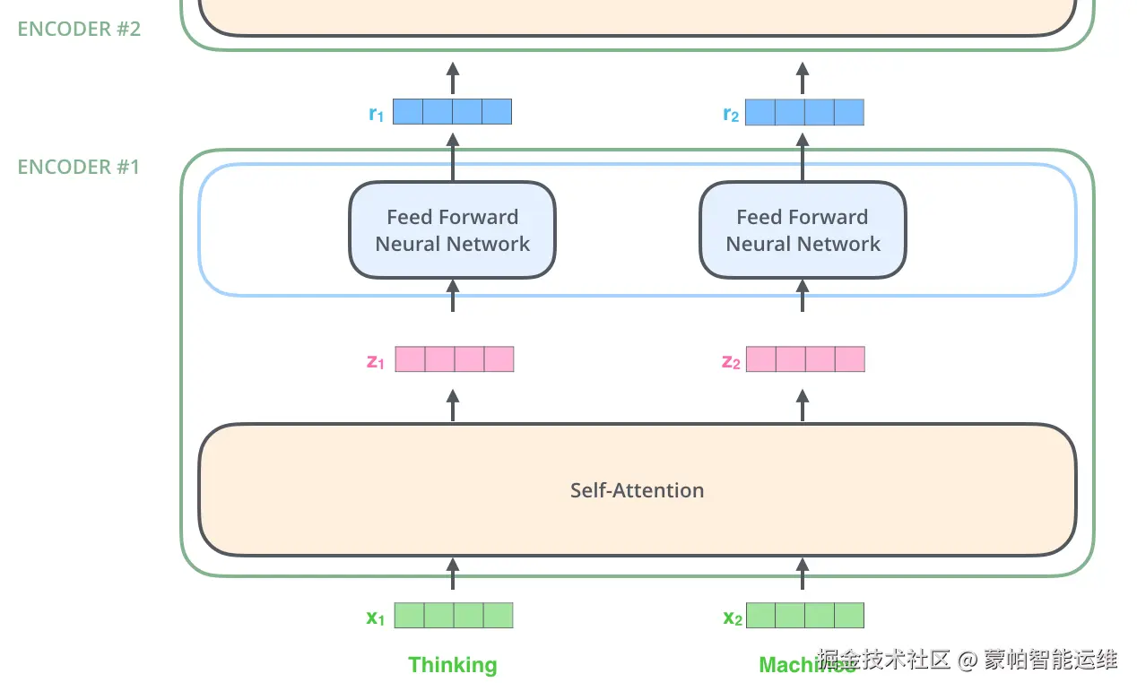 图3. 每个位置的词都会经过自注意力机制处理。然后,各自通过一个前馈神经网络(feed-forward neural network)进行处理。