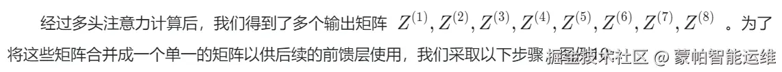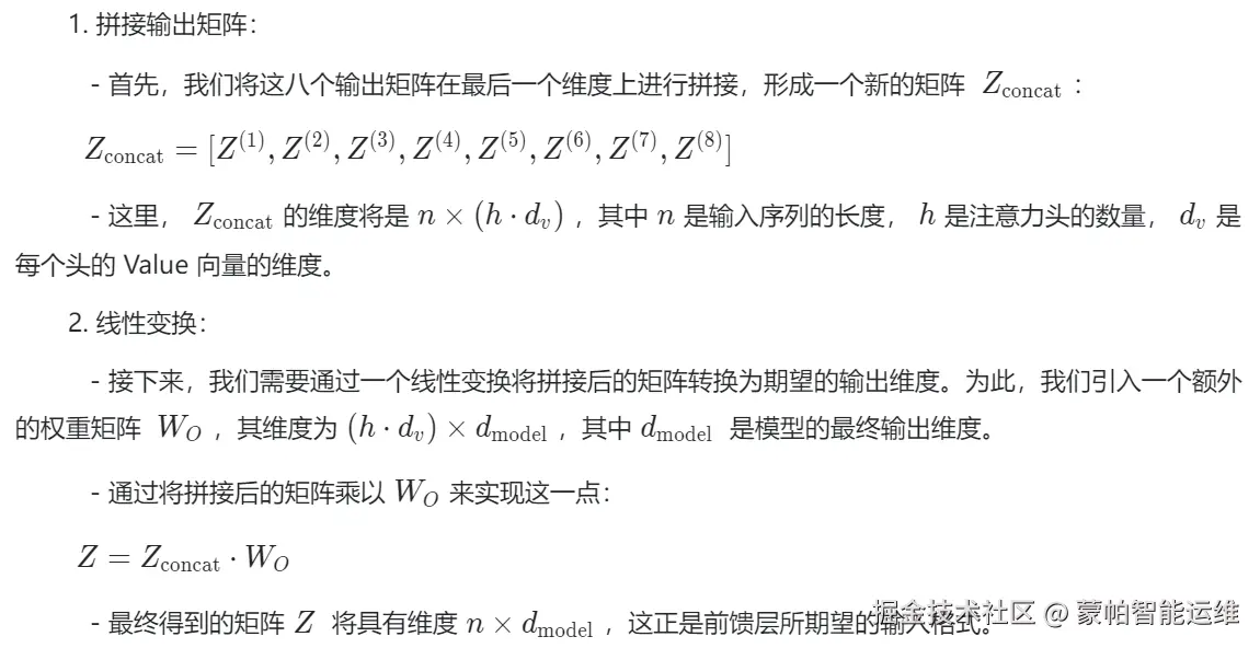 通过这种方式,有效地将多个注意力头的输出整合到一起,并为后续的计算做好准备。这种拼接和线性变换的过程使得模型能够充分利用多头注意力机制的优势,同时保持输入输出的维度一致性。
