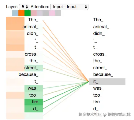 现在看一个例子,具体分析在编码句子中“it”这个词时,各个注意力头的关注点。假设我们有一个句子,例如:“The animal didn't cross the street because it was too tired.” 在这个句子中,我们想要关注“it”这个词的上下文。