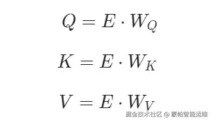 在self-attention中,每个单词有3个不同的向量,它们分别是Query向量Q,Key向量K和Value向量V,长度均是64。它们是通过3个不同的权值矩阵由嵌入向量E乘以三个不同的权值矩阵WQ,WK,WV得到,其中三个矩阵的尺寸也是相同的,均为dmodel×k,这里d×k = 64。具体公式如下: