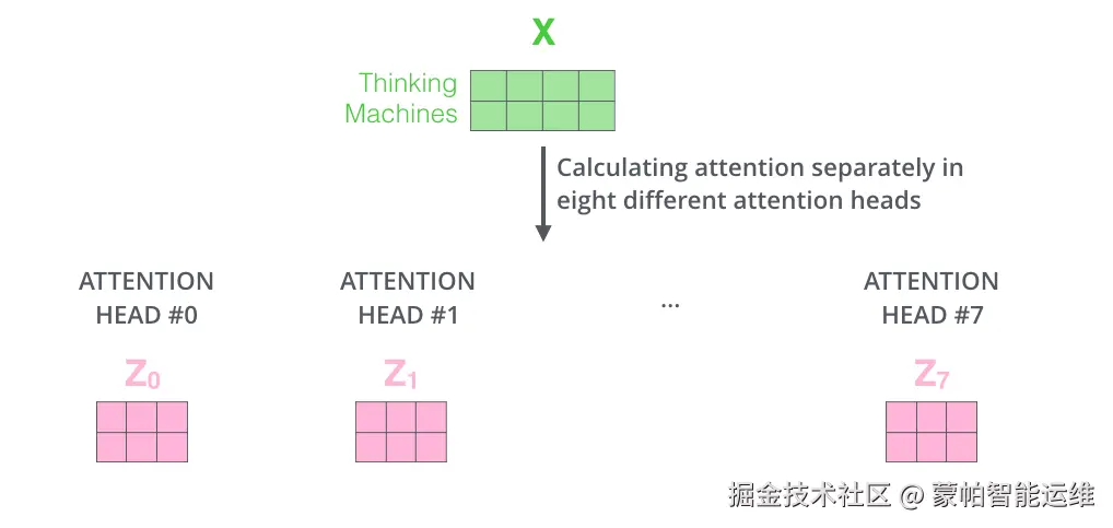 在多头注意力机制中,我们为每个注意力头维护独立的 Query、Key 和 Value 权重矩阵,这样可以生成不同的 Q、K 和 V 矩阵。如果使用不同的权重矩阵进行相同的自注意力计算八次,我们将得到八个不同的输出矩阵Z,如图9所示。