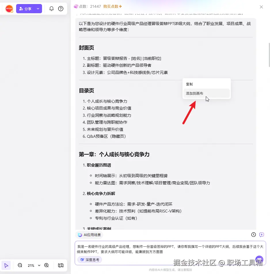 右击DeepSeek生成的PPT大纲,选择“添加到画布”,将PPT大纲插入左侧的AI创作工作空间。