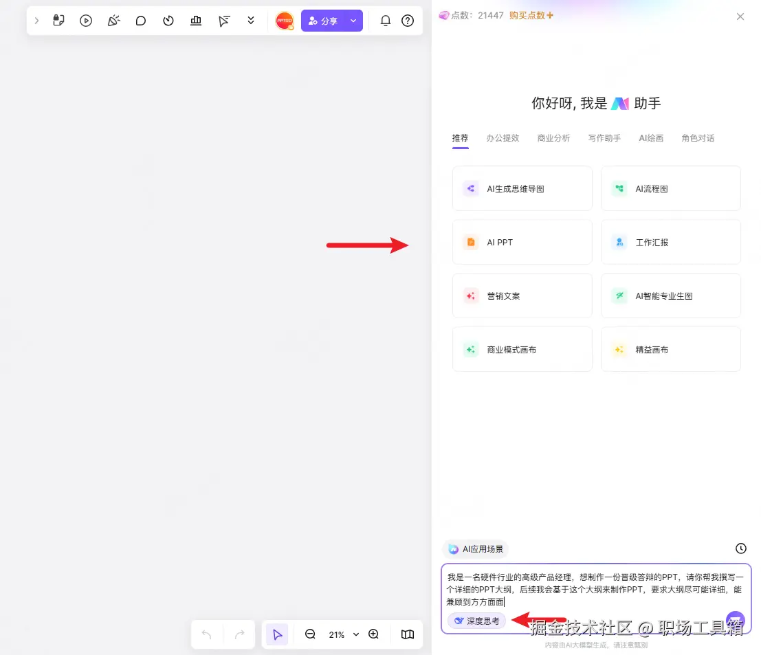 右侧是DeepSeek生成的PPT大纲,接下来就可以使用boardmix内置的AI PPT智能体,基于DeepSeek返回的大纲内容生成完整的PPT演示文稿。