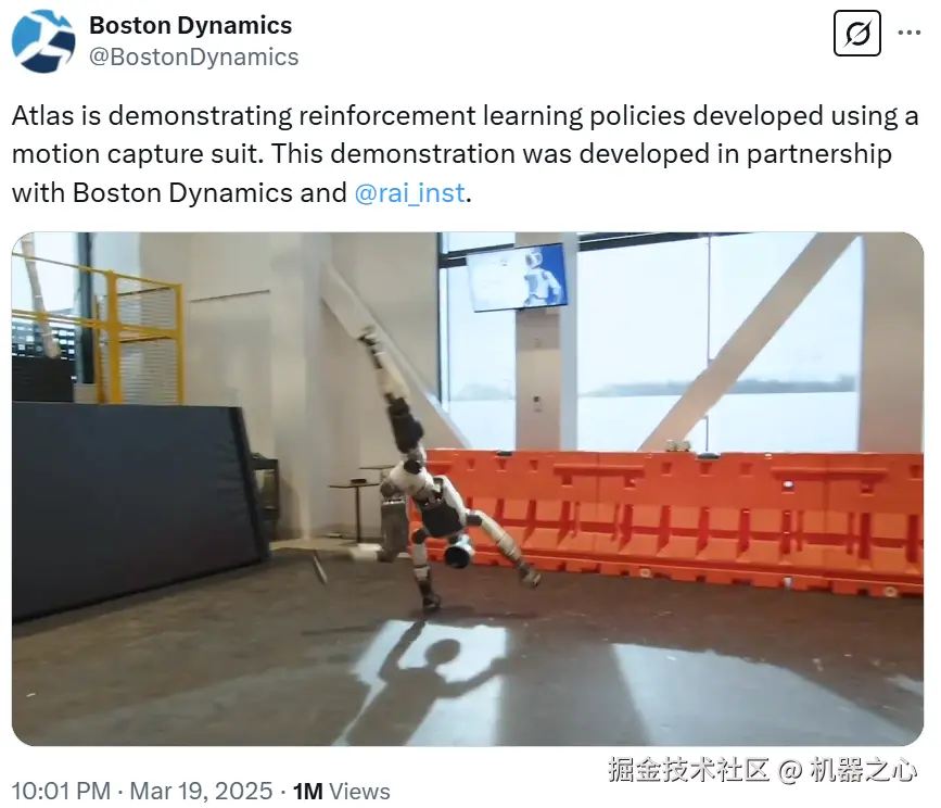 波士顿动力表示,Atlas 演示的是「使用动作捕捉服开发的强化学习策略」。而该策略是波士顿动力与 RAI Institute 一起合作开发的,而后者的「使命是解决 AI 和机器人领域最重要和基本的难题」。