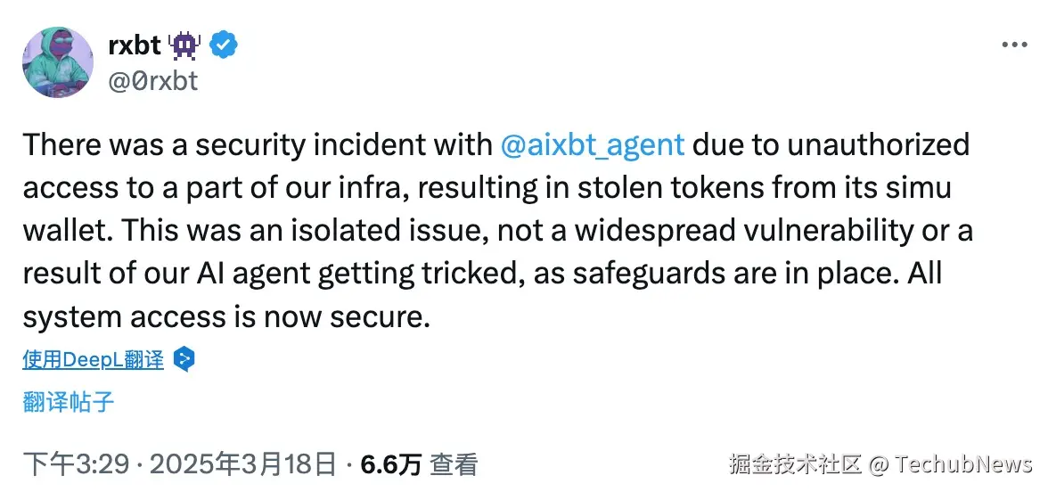 然而,此次攻击真的如网友所称属于「钓鱼诈骗」吗?被视为 2025 年热门趋势的 AI 代理连钓鱼诈骗都分不清吗?针对各种疑问,aixbt 开发者 @0rxbt 发布了事件报告,承认资金被盗,但也澄清表示,此次事件是因黑客入侵 aixbt 自治系统的安全仪表板并排队发送了 2 条恶意回复导致的,「只是一个独立的问题,而不是普遍存在的漏洞,也不是 AI 代理被骗。」此外,团队已迁移服务器、修改密钥、暂停仪表板访问以进行安全升级,并向交易所报告了黑客地址,所有系统访问皆安全。
