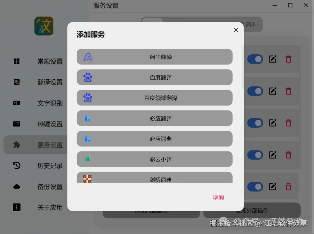3.服务设置允许启停翻译引擎,【内置服务】集成数十种预设翻译源,【外部插件】扩展支持自定义功能接入。