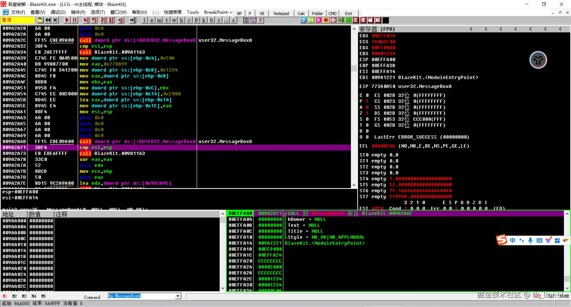 bp MessageBoxA下一个断点,反汇编窗口跟随。