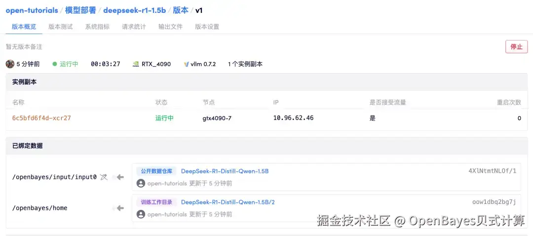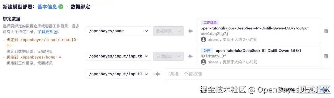 - 在数据绑定这里,选择「DeepSeek-R1-Distill-Qwen-1.5B」模型,绑定到/openbayes/input/input0,并将刚才容器的工作空间绑定到 /openbayes/home 后,点击「部署」。