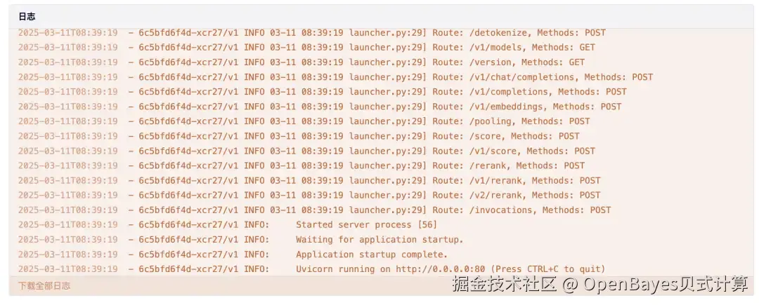 - 待模型部署状态变更为运行中,点击运行的模型部署版本,可以看到当前部署的详细内容以及日志。