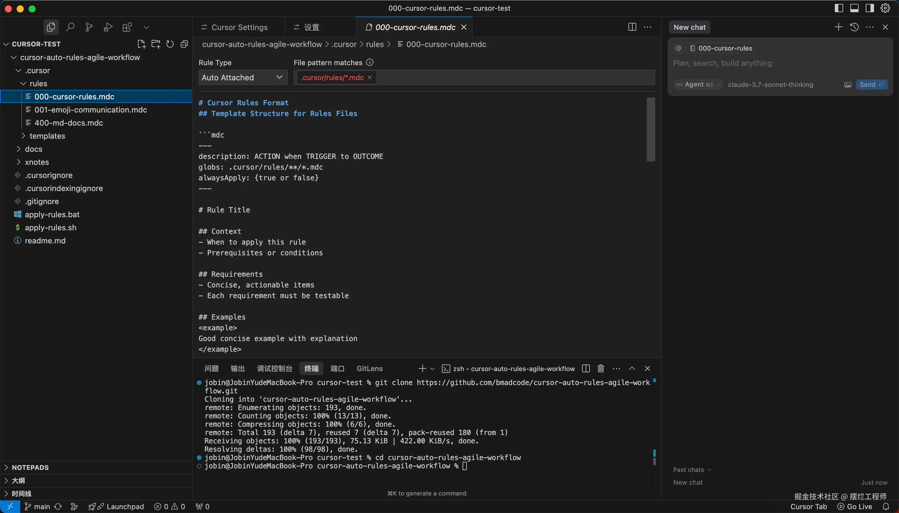 克隆之后,就会有对应的cursor的rules,你查看000-cursor-rules.mdc文件时,会发现一些红色警告的匹配规则,这个时候,需要你把当前工作区的警用掉mdc。