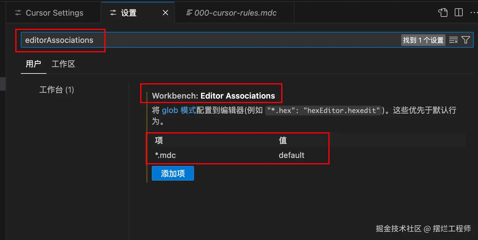 路径:首先项 -> 设置 -> 工作区,如何搜索editorAssociations, 就可以添加对应的配置。