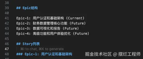也就是让 Cursor 进行分析 prd 文档,根据需求生成一个技术架构,根据prd文档的Epic结构拆解成多个任务,每个Epic生成对应的story-1、story-2等等。