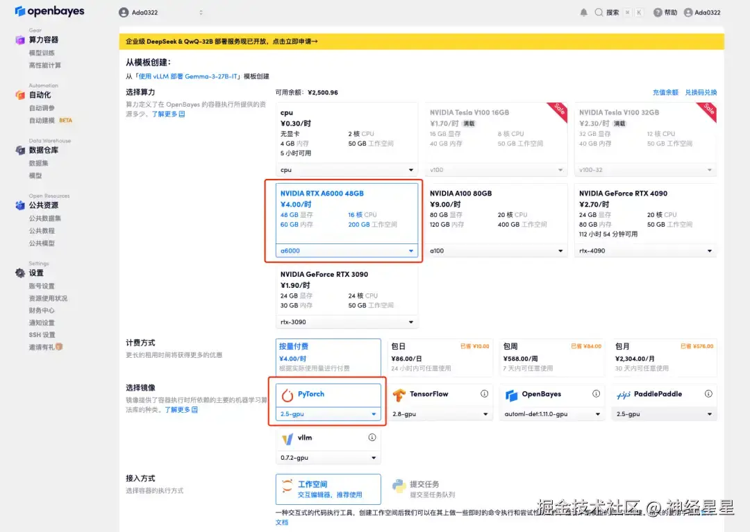 3.选择「NVIDIA A6000」以及「PyTorch」镜像,点击「继续执行」。我们已经将最新版本的 vLLM 提前 input 到了容器中。