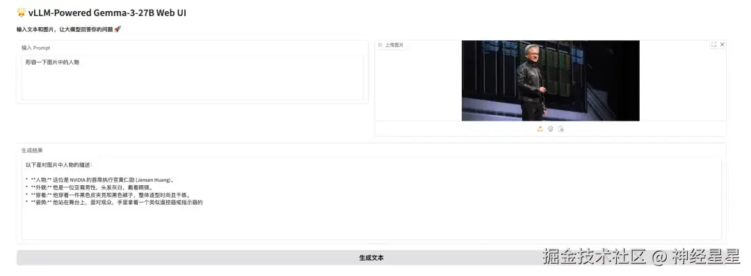昨天(3 月 19 日)凌晨,「皮衣刀客」黄仁勋在 NVIDIA GTC 2025 带来了主题演讲,小编用他测试了一下 Gemma 3 对于图片的理解,其不仅一眼认出了老黄,还识别出他手握遥控器,正站在舞台上,如下图所示: