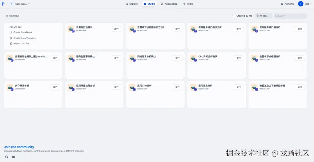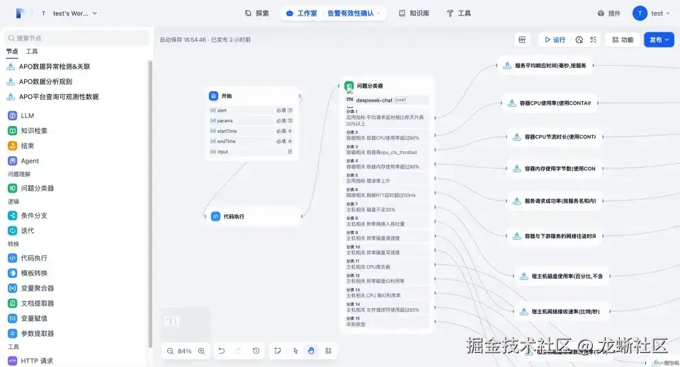 每个系统环境都有其独特性,预设工作流无法覆盖所有场景。因此,APO 专为可观测性领域打造了工作流编排平台。该平台基于最流行和最易用的通用 AI 工具 Dify 打造,APO 基于可观测性领域存在大量多模型数据的特点,为用户提供了一系列可直接拖拽使用的数据查询和异常检测工具,任何人都能够轻松地在这个平台上将自己的经验固化为工作流,为后续实现自治 Agents 奠定基础。