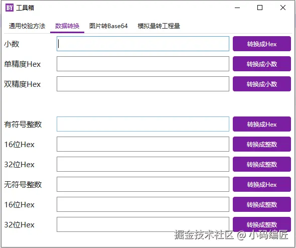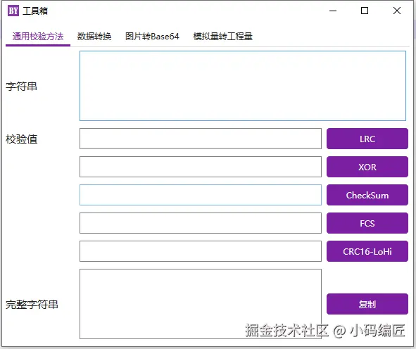 常用小工具:提供多种校验方法、数据转换工具、图片与Base64互转、模拟量与工程量转换、ASCII码表、颜色对照表和屏幕颜色拾取。