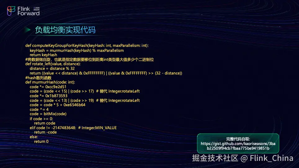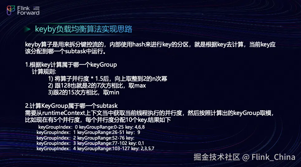 简单来说,就是通过 KeyBy 来计算当前 key 应该分配到哪个 Subtask 执行。这个过程分为两步:首先,你需要计算这个 key 属于哪个 key group。假设并行度为八,那么将这个并行度乘以 1.5 后向上取整到二的 n 次幂。第二步是与 128(即二的七次方)以及二的 15 次方进行比较,取最大值和最小值。团队计算出这个 key 属于哪个 key group 后,下一步就是确定这个 key group 中哪一个 Subtask 能够执行这个 key。这需要从它的 Long run time 中取出当前并行度要计算的 key group 进行取模运算,上图最下面是一部分打印结果。