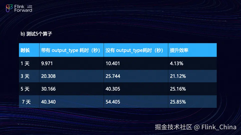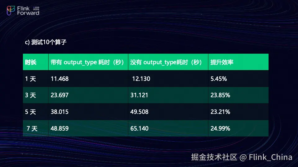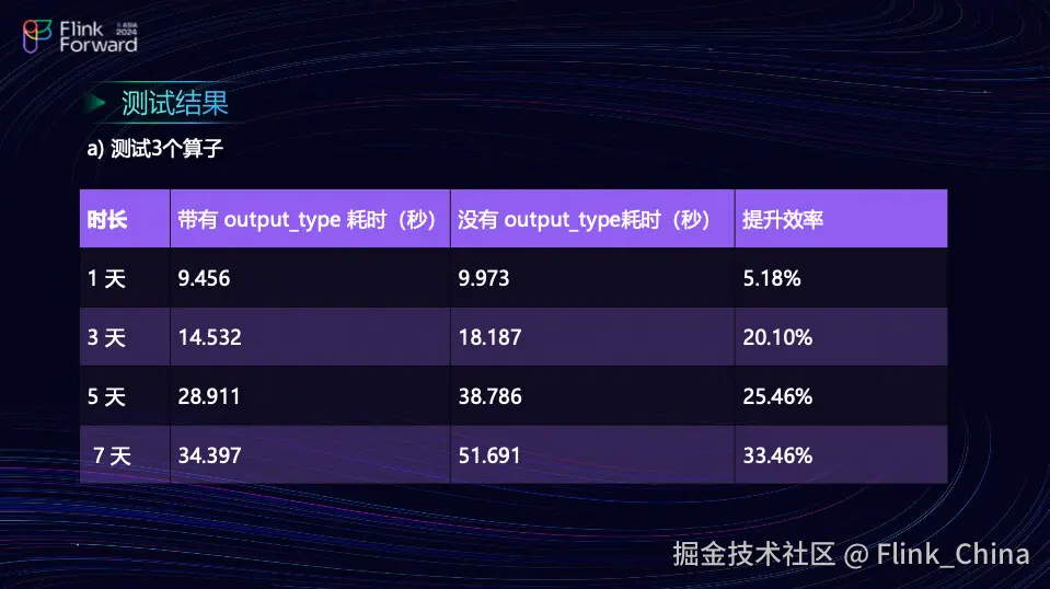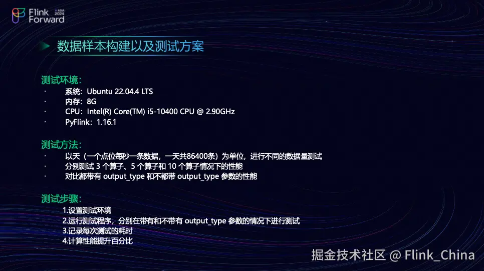 团队采用了 Intel 的 i5-10400 CPU,配备四核和 8GB 内存,使用的 PyFlink 版本为 1.16.1。测试方法是在一个点位上每天每秒记录一条数据,总共记录 86400 条数据。团队进行了不同数据量的测试,分别评估了在各种情况下三个和五个算子的性能表现。在测试中,团队比较了输出结果与上一个算子的输出 Schema,以及在不输出 Schema 的情况下性能的变化。