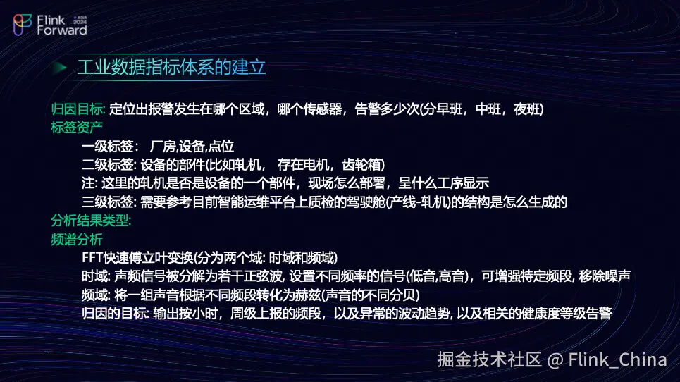 对工业数据指标的建立感兴趣的朋友可以了解一下。刚刚提到,将建立用户画像标签库和用户行为库。既然建立了仓库,势必要为数据部门的归因提供一定的定位。归因目标是确定告警发生在哪个区域、哪个传感器、告警了多少次,是早班、中班还是晚班。团队的数据资产首先分为厂房点位,其次是设备部件,如闸机、电机、齿轮等。第三级是面向每个客户的场景,我会查看驾驶舱内从一个产线到闸机的结构是如何生成的。团队的分析类型,以苹果分析为例,包括 FFA 的浮列变换,它涉及两个域:时域和频域。时域指的是音频信号会分裂分解成若干正弦波,设置不同的频率信号增强其相应的频段。频率则是将一组声音的不同频段转换为赫兹。团队归根的目标是什么呢?是按小时、周集上报的频段以及异常的波动趋势,以及相关的健康度等。