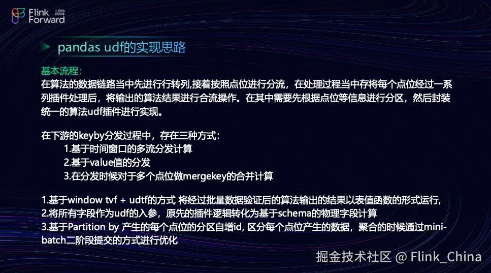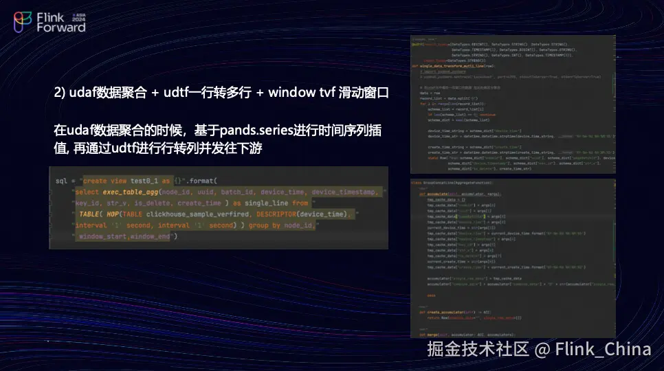 第二种方法是结合 UDAF(用户定义聚合函数)进行数据聚合,UDTF(用户定义表生成函数)将单行数据转换为多行,再配合滑动窗口的 Window TF 进行处理。以上就是相关代码的概述。简单概述一下工作内容:首先,团队需要在内存中进行数据补全。例如,通过开启一分钟的窗口来暂存数据,待数据修改完成后,将其放入一个 Python 迭代器中。接着,利用 Udtf(用户定义的表生成函数)将数据从单行转换为多行,逐条通过 Python迭代器输出。虽然这种方法较为原始,但为了确保业务的正常运行,团队不得不采取这种方式。此外,团队还会结合 Udtf 将数据分散到每个平衡度中。