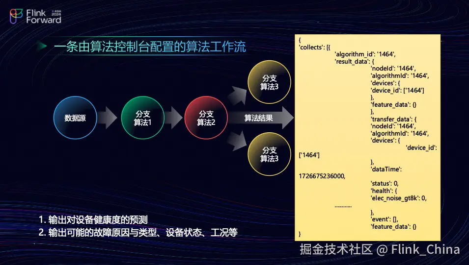 团队工作控制台负责配置算法控制流和数据源,数据源可以是 Kafka 或历史数据仓库。在算法一中,可能采用分类评估算法。例如,团队可能设计了一个从 2K 到 4K、6K 到 18K 的分类识别算法,用于将数据分为不同的区间。接下来,根据特定的频段进行噪声识别。例如,如果工况大于某个特定的 K 值,数据会被归入区间一;如果工况大于另一个 K 值,则归入区间二。最后,团队应用事件算法,将各种算法的输出匹配到不同类型的事件中。为了让大家更清楚地了解,以下将展示团队算法输出结果的具体形式。