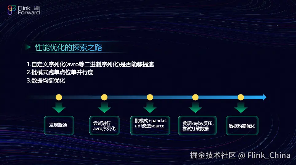接下来,团队将探索一条更加优化的道路。起初,团队考虑了批量化处理,发现传统的序列化格式并不适用,因此探讨了是否可以采用二进制格式进行序列化,例如 Protocol Buffers (PB) 或 Avro。同时,团队还考虑通过增加并行度来加速作业的执行。经过一系列调优过程,团队逐步优化了数据处理的效率。