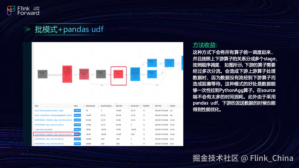 如上图所示,采用批模式加 Pandas UDF 的方式可以清晰地展示出,前面的反压是偶尔形成的,并不会经常出现。而中间的反压是横跨 KeyBy 的,这种方式会导致一部分性能损耗在 KeyBy 上。这是团队接下来可能要讨论的关键问题——KeyBy 均衡化。