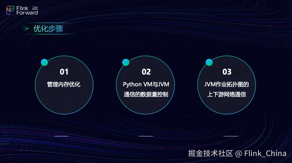 优化步骤分为三步,分别是是管理内存优化,以及 Python VM 和 JVM 的通信数据量控制,以及 JVM 作业拓扑的上下游网络通信。