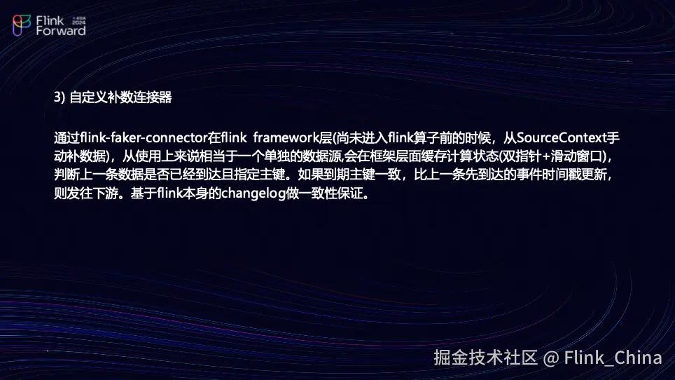 下一种方法是团队会自定义一个补数连接器,目前仍在开发中,未来可能会开源。这个连接器基于 Flink-Faker-Connector,并在 Flink 的框架层上进行操作。团队会在 Flink 算子执行前,从上下文中补全数据。简而言之,团队会在框架层面缓存计算状态,并通过双指针和滑动窗口的方式判断上一条数据是否已到达主键。如果组件一致且时间戳更新,团队会集成 Upsert Kafka 来实现一致性保障。