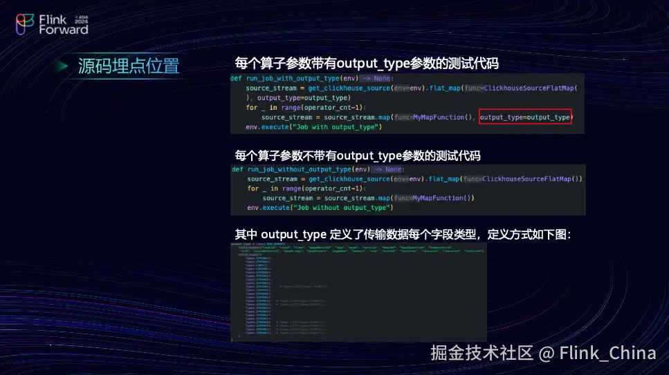 测试的关键点在于 PyFlink,它在实际应用中需要指定输出显示的 Schema 类型。具体而言,这些数据包括高分震动、高分均值、高分采样等,它们实际上是团队边缘端上传的原始数据。这些数据在一个算子输出时,由用户直接定义,用于测试三个算子的性能和性能损耗。