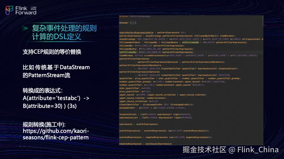 这个工具是团队自行开发的,它的用途是尽管定义了很多代码,但随着上层告警规则变得越来越复杂,你肯定不希望每次生成规则时都编译出大量代码。那么,解决方案是什么呢?我将基于 Anltr4 定义一个表达式引擎,并将其桥接到 CEP 的 Operator 中。这就是我目前正在进行的工作。