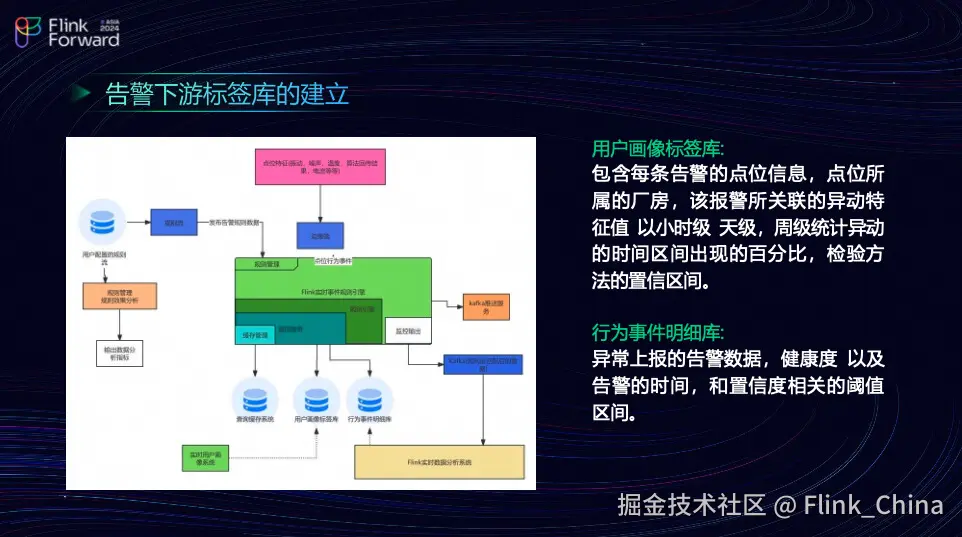 这是团队告警下游的标签库建立过程。最上层是团队从边缘端收集的各种数据,如震动、噪声、温度和电流等,这些数据上传后会经过分发端,最终下发到 Flink 实时计算引擎中。可以理解为,团队会为各种规则进行计算,例如转速大于五且电流超过特定毫安数,以及特征值等于某个值等复杂表达式的定义。团队定义完毕后,匹配到的数据会被分为两个库:一个是用户标签库,一个是行为明细库标签库,即团队会将每次点名的信息与你所属厂房的报警系统关联,记录异动特征值,并以小时、天、周为周期进行统计异动的百分比。