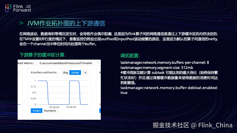 接下来,团队将讨论 JVM 作业拓扑图的上下游网络通信。在发生网络波动和数据堆积的情况下,作业偶尔会阻塞,这是因为 Flink 算子通信时,上游缓冲区的内存大小决定的。Netty 框架由服务端的缓冲区和客户端的缓冲区组成,只有在数据被刷出去的那一刻,消息才算是真正发送出去。同样地,Flink 的算子内部也有缓冲区。