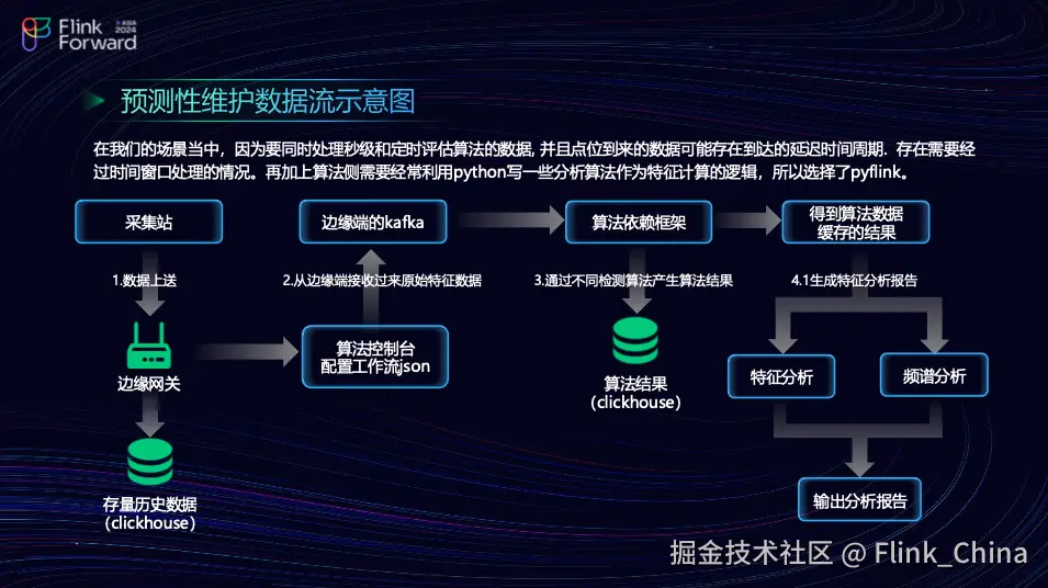 首先,简要介绍团队的整体架构图。团队的工作流程始于数据采集站,数据首先被上传至边缘网关,然后存储到历史数据仓库中。接下来,团队从边缘网关获取数据,并将其与算法控制台的配置相关联。算法控制台的配置会与边缘端的 Kafka 系统同步。当数据被推送到算法依赖框架时,该框架利用评估和识别算法生成不同的算法结果,这些结果最终也会存储到历史数据仓库中。此外,还有一条分支路径,通过算法数据缓存生成两种不同的特征分析报告:一种是特征分析报告,另一种是评估分析报告。